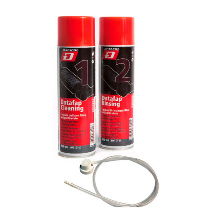 Komplet čine sljedeća dva proizvoda: Z350324 Datafap cleaning spray – tekućina za pranje Deterdžent za čišćenje DPF-filtera – Datafapcleaning je nezapaljiva tekućina u potpunosti bez aerosola, posebno formulirana za čišćenje i prisilnu regeneraciju FAP-filtera i DPF-filtera. Zahvaljujući svojoj kemijskoj formulaciji i načinu nanošenja ovaj deterdžent može dubinski djelovati na filtrirajući element u obliku saća u DPF-filterima. Lako uklanja ostatke ugljena i čađe koji ometaju normalan prolazak ispušnih plinova motora i ponovno uspostavlja normalan rad ove osjetljive komponente. Način upotrebe Proizvod se nanosi kad je motor ugašen, a odvodni sustav hladan: poprskajte po vrhu DPF-filtera približno 500 ml deterdženta u smjeru izlaza odvodnog sustava. Ostavite da djeluje 30/40 minuta, a zatim na isti način poprskajte namjensku tekućinu za ispiranje – Datafaprinsing spray Z350325. Prednosti • Iznimna brzina primjene bez potrebe za rastavljanjem. • Velika štedljivost. • Proizvod koji je posebno formuliran da ne uništi plemenite metale prisutne u filterima. Važno: uvođenje sonde u odvodni sustav može se izvesti senzorom tlaka prije DPF-filtera ako odspojite cijev za protok ili ako za nekoliko milimetara olabavite prirubnice na samom filteru. Pažnja: cijeli ciklus čišćenja neće biti učinkovit ako su u filteru prisutna mikro fuzije metala koje čine ćelije saća. Z350325 Datafap rinsing spray – tekućina za ispiranje Tekućina za ispiranje za čišćenje DPF-filtera Datacol posebno je formulirana tekućina za pranje FAP-filtera i DPF-filtera nakon nanošenja namjenskog sredstva za čišćenje Z350324. Zahvaljujući svojoj kemijskoj formulaciji i načinu nanošenja ovaj deterdžent može dubinski djelovati na filtrirajući element u obliku saća u DPF-filterima. Lako uklanja ostatke ugljena i čađe koji ometaju normalan prolazak ispušnih plinova koji su uklonjeni deterdžentom Z350324, čime je olakšana prisilna regeneracija.